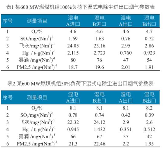 針對某600MW燃煤機組工程化應用在100%負荷及50%負荷條件下進行了測試,測試結(jié)果詳見表1和表2,出口煙塵濃度均滿足設計值,也大大低于超低排放標準,同時濕電對三氧化硫、汞及霧滴的協(xié)同脫除作用也非常明顯。