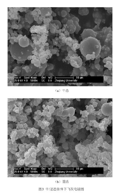 此外,還對濕態(tài)與干態(tài)條件下進口處粉塵形貌變化進行了表征。采用電子顯微鏡拍攝,放大倍率均為5000倍,采用鍍鋅片作為顆粒物的載體,可清晰觀測到10μm左右顆粒物形態(tài)。從圖3中可看出,在濕態(tài)狀態(tài)下,大顆粒物明顯減少,細顆粒物團聚增強,且顆粒邊緣清晰度降低。由此可見,液滴對10μm及以下的顆粒物具有一定的清洗作用,同時對細顆粒物具有團聚的作用。